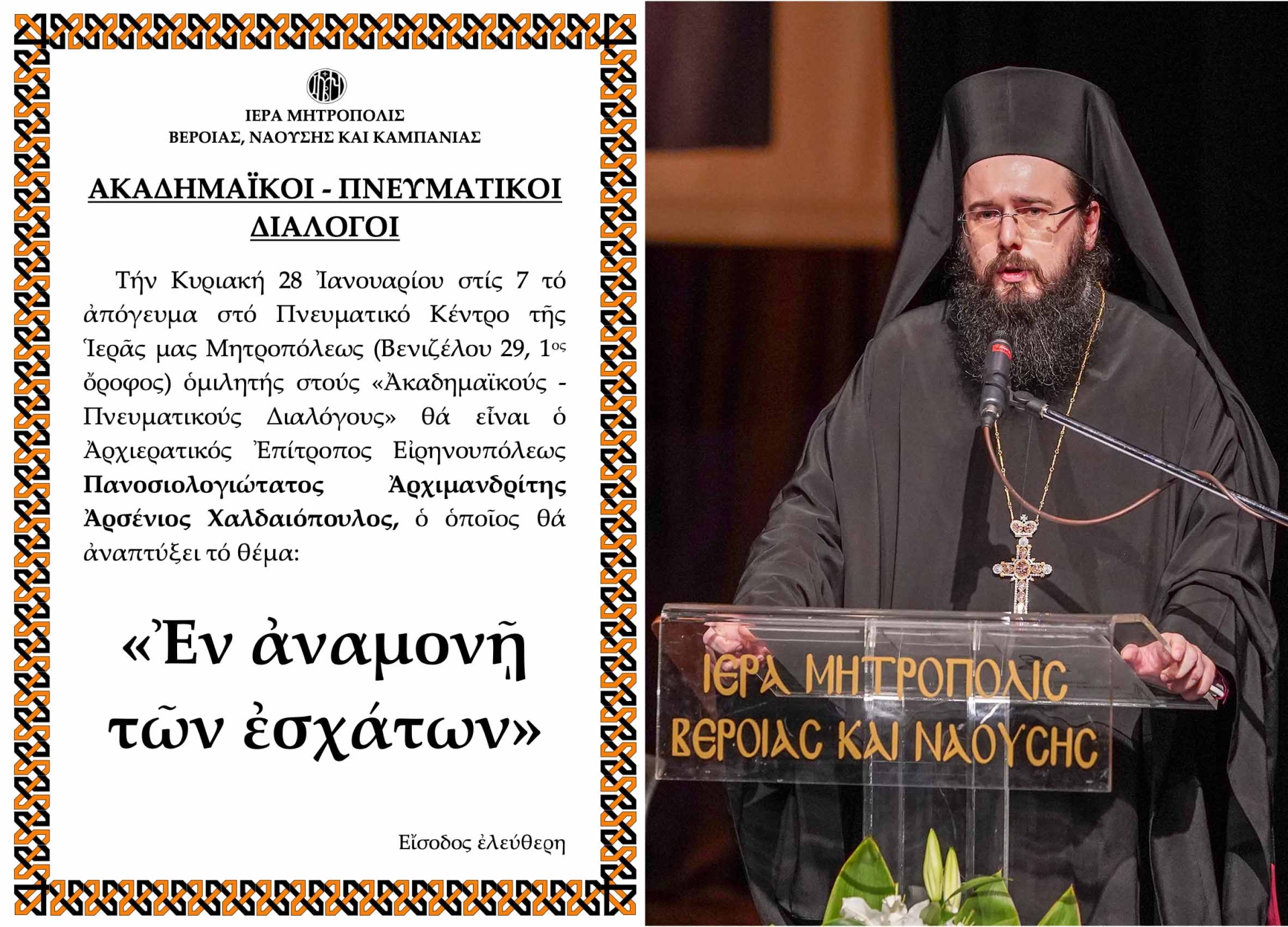 Τήν Κυριακή 28 Ἰανουαρίου στίς 7 τό ἀπόγευμα στό Πνευματικό Κέντρο τῆς Ἱερᾶς μας Μητροπόλεως (Βενιζέλου 29, 1ος ὄροφος) ὁμιλητής στούς «Ἀκαδημαϊκούς – Πνευματικούς Διαλόγους» θά εἶναι ὁ Ἀρχιερατικός Ἐπίτροπος Εἰρηνουπόλεως Πανοσιολογιώτατος Ἀρχιμανδρίτης Ἀρσένιος Χαλδαιόπουλος, ὁ ὁποῖος θά ἀναπτύξει τό θέμα: «Ἐν ἀναμονῇ τῶν ἐσχάτων».