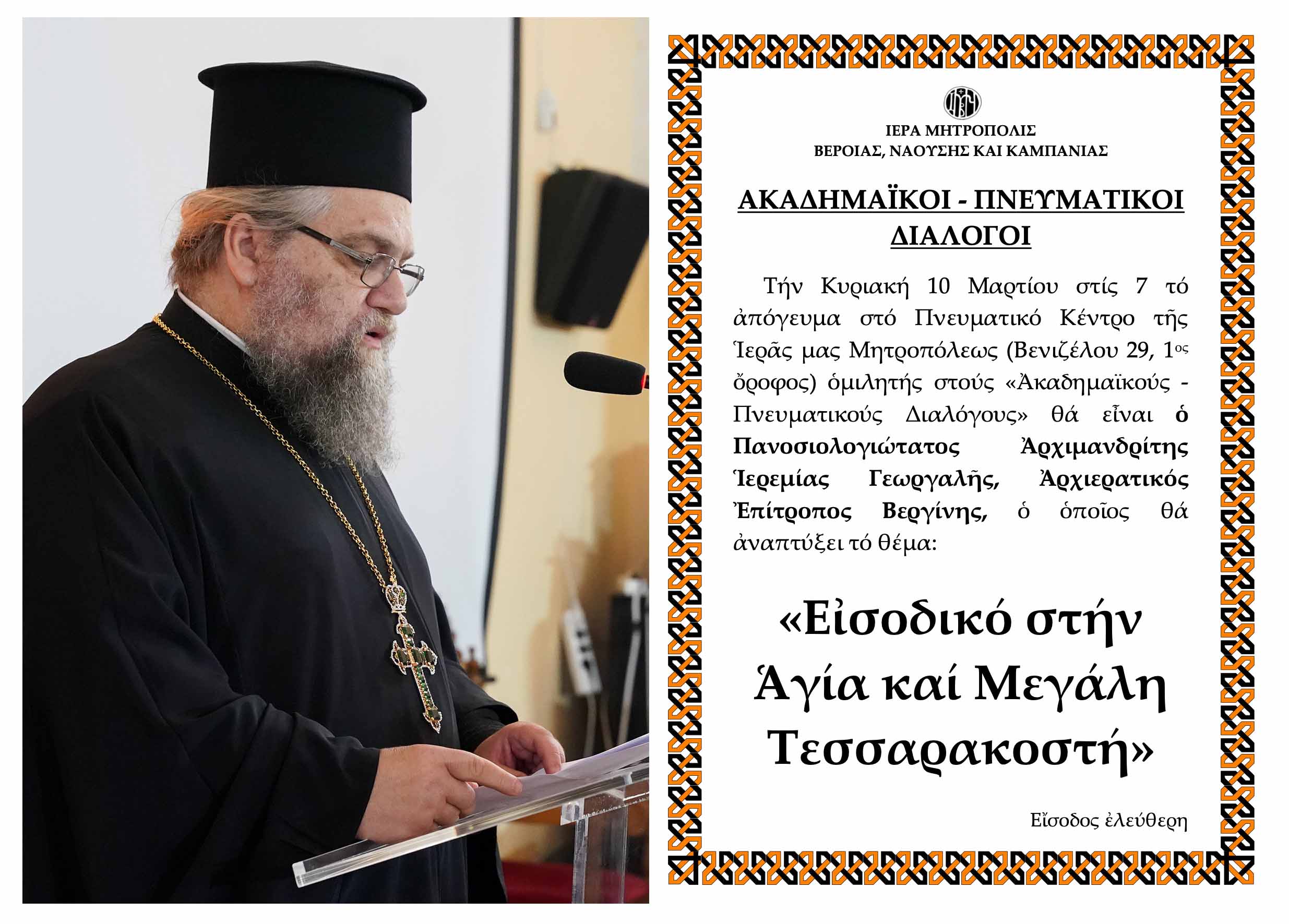 Τήν Κυριακή 10 Μαρτίου στίς 7 τό ἀπόγευμα στό Πνευματικό Κέντρο τῆς Ἱερᾶς μας Μητροπόλεως (Βενιζέλου 29, 1ος ὄροφος) ὁμιλητής στούς «Ἀκαδημαϊκούς – Πνευματικούς Διαλόγους» θά εἶναι ὁ Πανοσιολογιώτατος Ἀρχιμανδρίτης Ἱερεμίας Γεωργαλῆς, Ἀρχιερατικός Ἐπίτροπος Βεργίνης, ὁ ὁποῖος θά ἀναπτύξει τό θέμα: «Εἰσοδικό στήν Ἁγία καί Μεγάλη Τεσσαρακοστή».