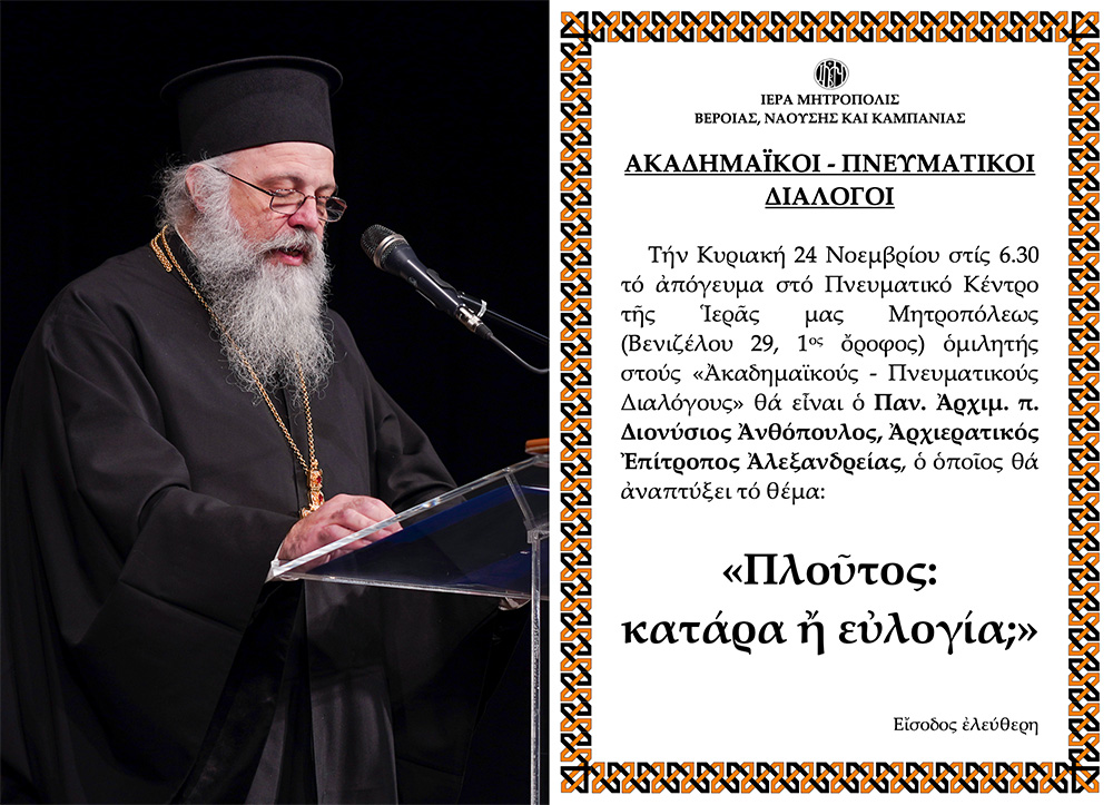Τήν Κυριακή 24 Νοεμβρίου στίς 6.30 τό ἀπόγευμα στό Πνευματικό Κέντρο τῆς Ἱερᾶς μας Μητροπόλεως (Βενιζέλου 29, 1ος ὄροφος) ὁμιλητής στούς «Ἀκαδημαϊκούς – Πνευματικούς Διαλόγους» θά εἶναι ὁ Παν. Ἀρχιμ. π. Διονύσιος Ἀνθόπουλος, Ἀρχιερατικός Ἐπίτροπος Ἀλεξανδρείας, ὁ ὁποῖος θά ἀναπτύξει τό θέμα: «Πλοῦτος: κατάρα ἤ εὐλογία;».