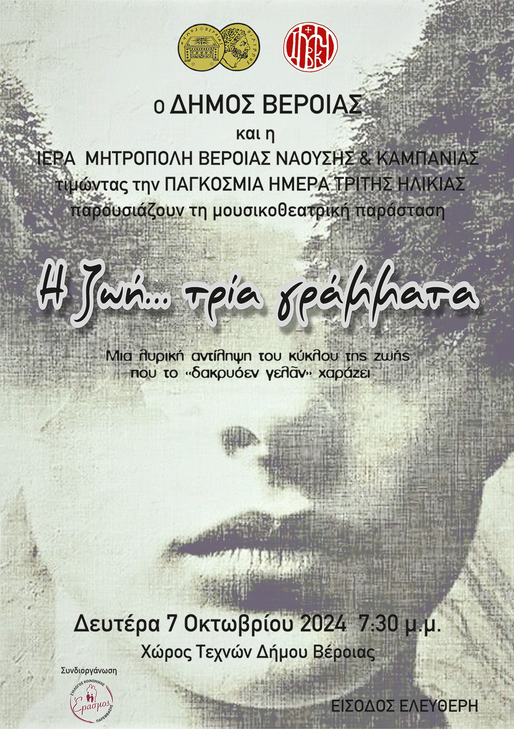 Τη Δευτέρα 7 Οκτωβρίου στις 7.30 μ.μ. στον Χώρο Τεχνών του Δήμου Βεροίας η Ιερά Μητρόπολις Βεροίας, Ναούσης και Καμπανίας και ο Δήμος Βεροίας σε συνδιοργάνωση με τον Σύλλογο Κοινωνικής Παρέμβασης «Έρασμος» τιμώντας την παγκόσμια ημέρα τρίτης ηλικίας παρουσιάζουν τη μουσικοθεατρική παράσταση «Η ζωή… τρία γράμματα» σε επιμέλεια κειμένων – σκηνοθεσία της συνταξιούχου εκπαιδευτικού Κατερίνας Πασιοπούλου, μουσική επιμέλεια, ενορχήστρωση και διεύθυνση χορωδιών της Μουσικού Κατερίνας Σωτηρίου.