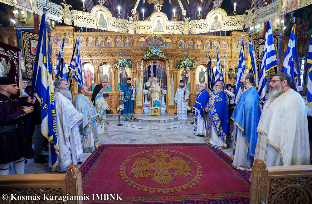 Γι᾽ αὐτό καί ἐμεῖς σήμερα, συνεχίζοντας τήν παράδοση τῶν πατέρων μας, ἤλθαμε στόν ναό τῆς Παναγίας μας, γιά νά τῆς ἀποδώσουμε «τά νικητήρια», γιά νά τῆς ἐκφράσουμε τήν εὐγνωμοσύνη μας, γιατί μέ τίς πρεσβεῖες της καί μέ τή μητρική της σκέπη καί προστασία ὁδήγησε τά βήματα τῶν στρατιωτῶν μας νικηφόρα μέχρι ἐδῶ γιά νά μᾶς ἀπαλλάξουν ἀπό τόν τουρκικό ζυγό.