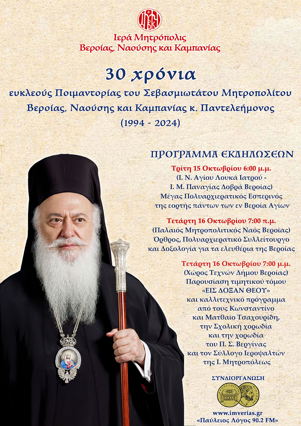 Η Ι. Μ. Βεροίας εορτάζει την 112η επέτειο των Ελευθερίων της Βεροίας και τιμά την επέτειο των τριάντα ετών ευκλεούς ποιμαντορίας του Σεβασμιωτάτου Μητροπολίτου μας κ. Παντελεήμονος. (ΠΡΟΓΡΑΜΜΑ)