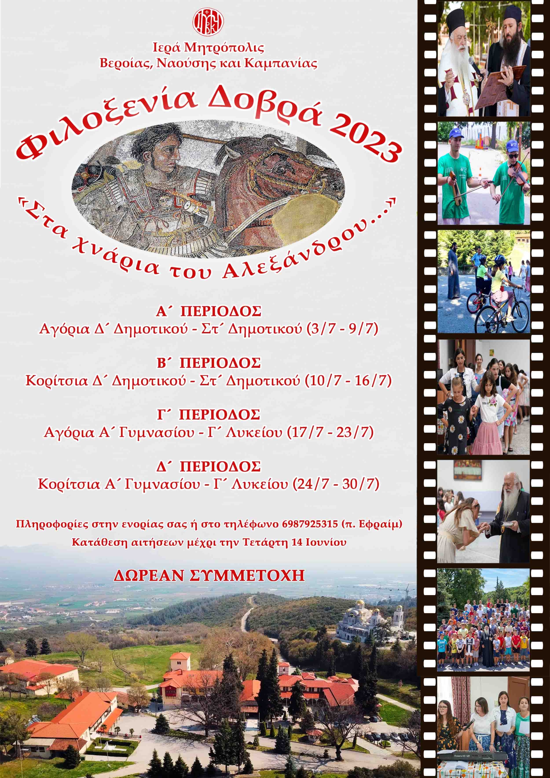 Ο Σεβασμιώτατος Μητροπολίτης μας κ. Παντελεήμων σας προτρέπει να ενθαρρύνετε τα παιδιά σας να συμμετέχουν στη «Φιλοξενία» στις εγκαταστάσεις της Ιεράς Μονής Παναγίας Δοβρά Βεροίας, για να έχουν την ευκαιρία να γνωρίσουν τις αλήθειες της πίστεώς μας, να αποκτήσουν εμπειρία κοινοτικής ζωής και φιλίες, να εξασκηθούν σωματικά και να ωφεληθούν πνευματικά κάτω από τη σκέπη της Υπεραγίας Θεοτόκου.