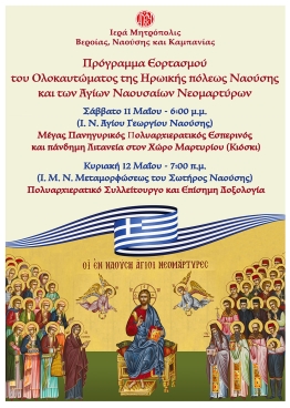 Η Νάουσα εορτάζει το ολοκαύτωμα της πόλεως και τη θυσία των 1241 Ναουσαίων Νεομαρτύρων. (ΠΡΟΓΡΑΜΜΑ ΕΟΡΤΑΣΜΟΥ)