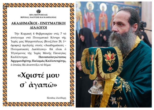 «ΑΚΑΔΗΜΑΪΚΟΙ – ΠΝΕΥΜΑΤΙΚΟΙ ΔΙΑΛΟΓΟΙ». O Καθηγούμενος της Ι. M. Παναγίας Καλλίπετρας Αρχιμ. Παλαμάς, ομιλητής την Κυριακή 4 Φεβρουαρίου.