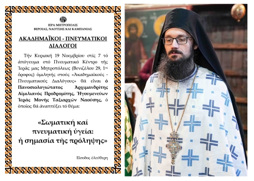 «ΑΚΑΔΗΜΑΪΚΟΙ – ΠΝΕΥΜΑΤΙΚΟΙ ΔΙΑΛΟΓΟΙ». O Aρχιμανδρίτης Αιμιλιανός Προδρομίτης, ομιλητής την Κυριακή 19 Νοεμβρίου.