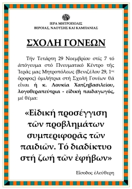 «ΣΧΟΛΗ ΓΟΝΕΩΝ». Η κ. Λουκία Χατζηβασιλείου, λογοθεραπεύτρια – ειδική παιδαγωγός, ομιλήτρια την Τετάρτη 29 Νοεμβρίου.